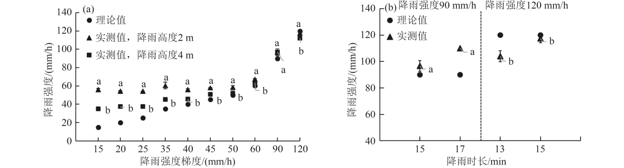 圖2 不同降雨高度下各降雨強度實(shí)測值、理論值對比和不同降雨時(shí)長(cháng)下降雨強度變化
