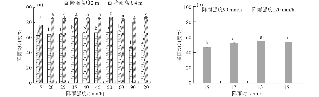 通過(guò)設定適合三個(gè)示范區的不同降雨強度、降雨高度、降雨時(shí)長(cháng),分析人工降雨裝置的雨強準確性、均勻度準確性及均勻度分布,發(fā)現隨雨強增加該裝置的雨強實(shí)測值越接近理論值,4m 降雨高度均勻度大于 2m ,且均勻度在 80% 左右,該裝置率定結果為實(shí)際應用人工降雨研究面源污染提供了參數設定依據。